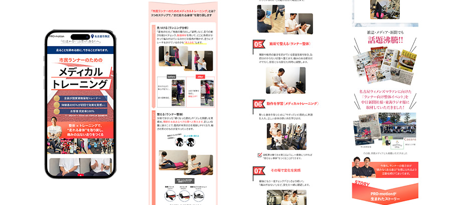 By pacer design / 11/05/2025 代表取締役/コンディショニングトレーナー 片浦 聡司 様 終始スピーディーかつ丁寧で、常にこちらの立場に立って考えてくださる姿勢が本当にありがたかったです。やり取りのたびに「この方は本気でクライアントの成果を考えている」と感じました。 ご提案の的確さと柔軟な発想力、そして圧倒的な熱量。 フリーランスという枠を超え、“プロデューサー”として伴走していただいた印象です。 代表取締役 コンディショニングトレーナー 片浦 聡司 様 終始スピーディーかつ丁寧で、常にこちらの立場に立って考えてくださる姿勢が本当にありがたかったです。やり取りのたびに「この方は本気でクライアントの成果を考えている」と感じました。 ご提案の的確さと柔軟な発想力、そして圧倒的な熱量。 フリーランスという枠を超え、“プロデューサー”として伴走していただいた印象です。 使用ツール:Photoshop、Wordpress担当:LPデザイン、実装制作時期:2025/10月制作期間:14日間 目的 体験申込を増やすための ランディングページ制作 ターゲット 30〜60代のランナー痛に悩む男女痛みがあり楽しく走れないランナー痛みの不安を抱えているランナー 希望の配色イメージ お任せ 希望のイメージ 図解やアイコンなど、理解しやすさを意識した提案歓迎 横幅 スマホ特化を意識して750pxでデザインを作成 実装 WordPressでの画像コーディング 制作時にこだわったPOINT Webデザイナーとしてだけではなく、私自身がランナーなのでランナー目線の思考をデザインに反映し、ご提案させていただきました。私自身、昨年大けがをした経験から、膝の痛みをどうにかしたい!痛いのを理由にやりたいことを諦めなければならない、もう膝が曲がらないし走れない。。。と絶望感を味わった立場だからこそのできる提案を片浦様には何個も何十個も提案させていただきました。片浦様ご自身がPRO-motionの未来をしっかり描かれており、その為にしなければならないこと、したい事を常に考えている熱い方だったので、pacer designの熱さを受け止めてくださったことが今回の制作では一番LPの仕上がりに影響したと感じています。片浦様、この度はありがとうございました。引き続きよろしくお願いいたします。 実際のLPページはこちら TOPに戻る 制作実績一覧に戻る